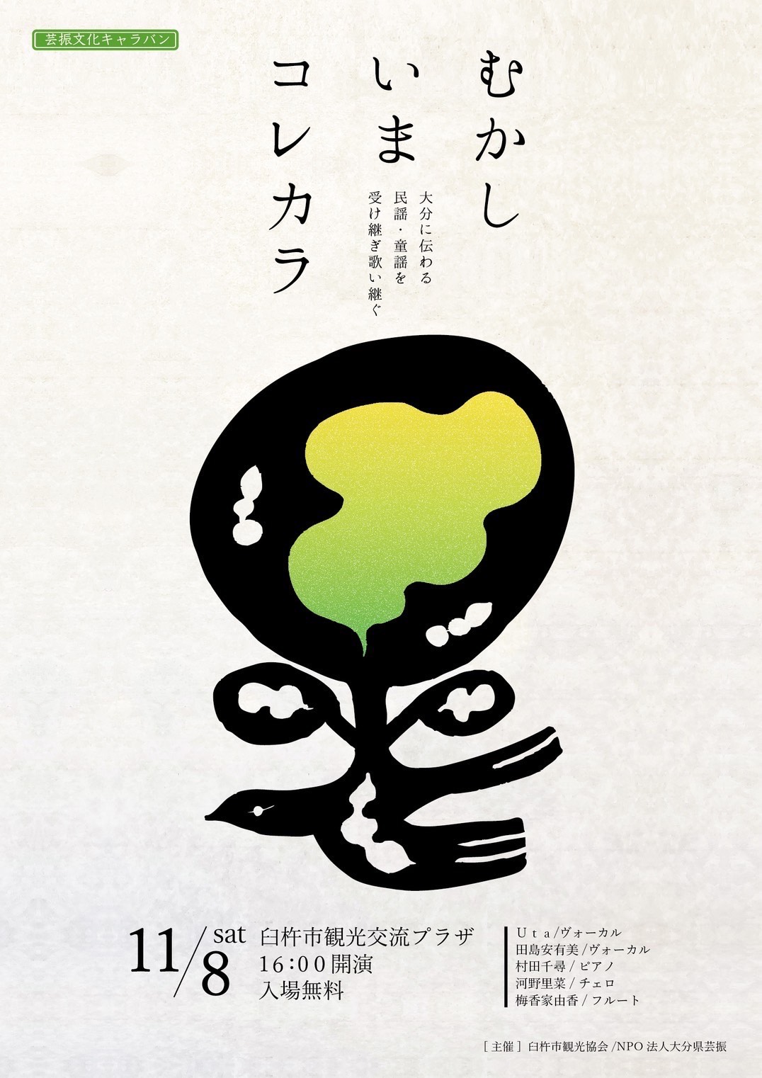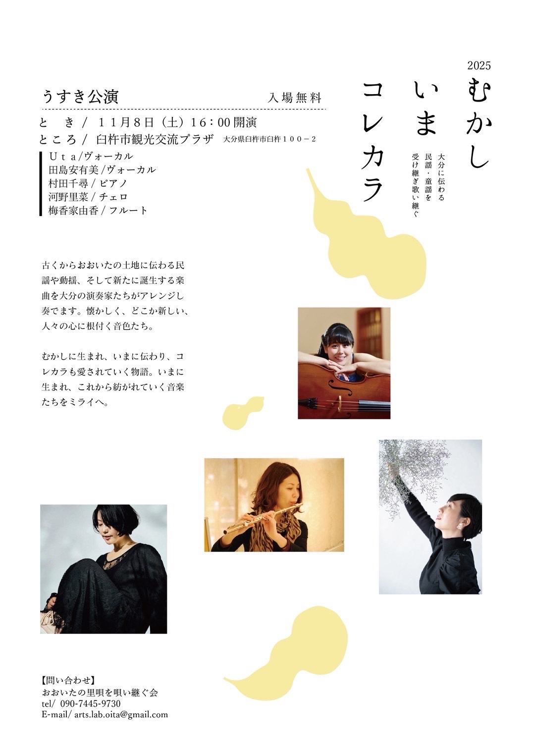 古くからおおいたの土地に伝わる民謡や童謡、そして新たに誕生する楽曲を大分の演奏家たちがアレンジし奏でます。懐かしく、どこか新しい、人々の心に根付く音色たち。