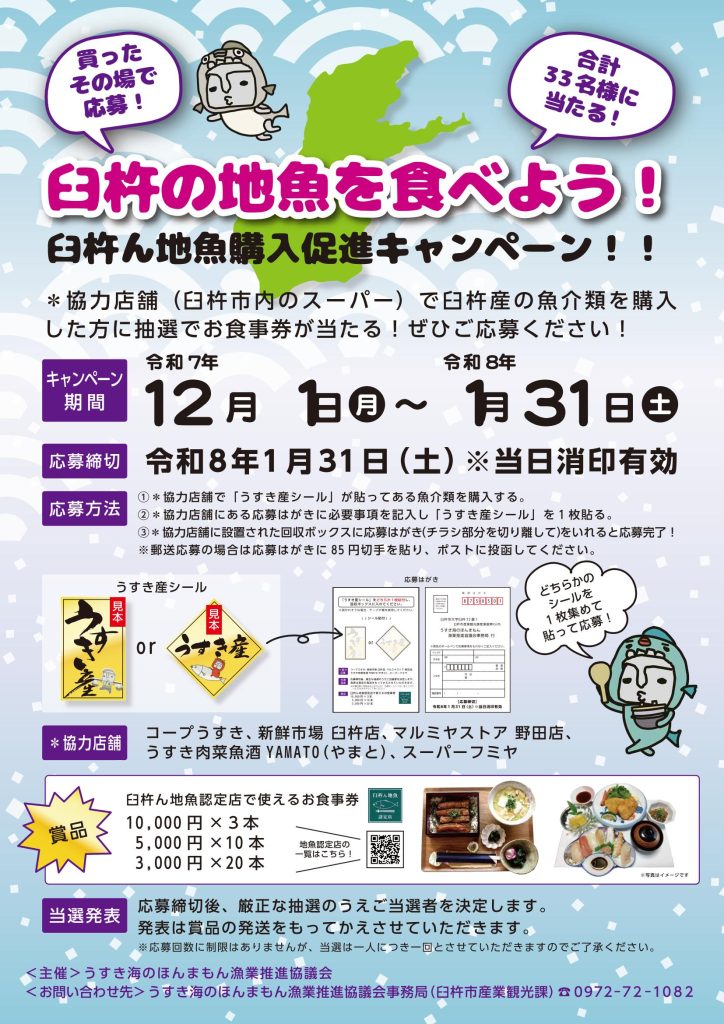 「うすき産シール」が貼り付けられた臼杵産魚介類を*協力店舗で購入し、応募することで臼杵ん地魚認定店で使えるお食事券が当たるキャンペーンを実施中!ぜひご応募ください!