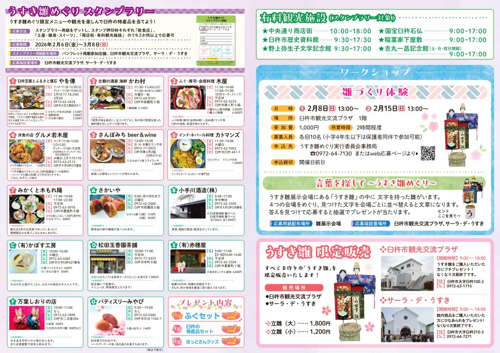 うすき雛めぐリ限定メニューや観光を楽しんで臼杵の特産品を当てよう!スタンプラリー用紙をゲットし、スタンプ押印枠それぞれ「飲食店」、「土産・雑貨・スイーツ」、「商店街・有料観光施設」 のうち2か所以上で応募できます♪
