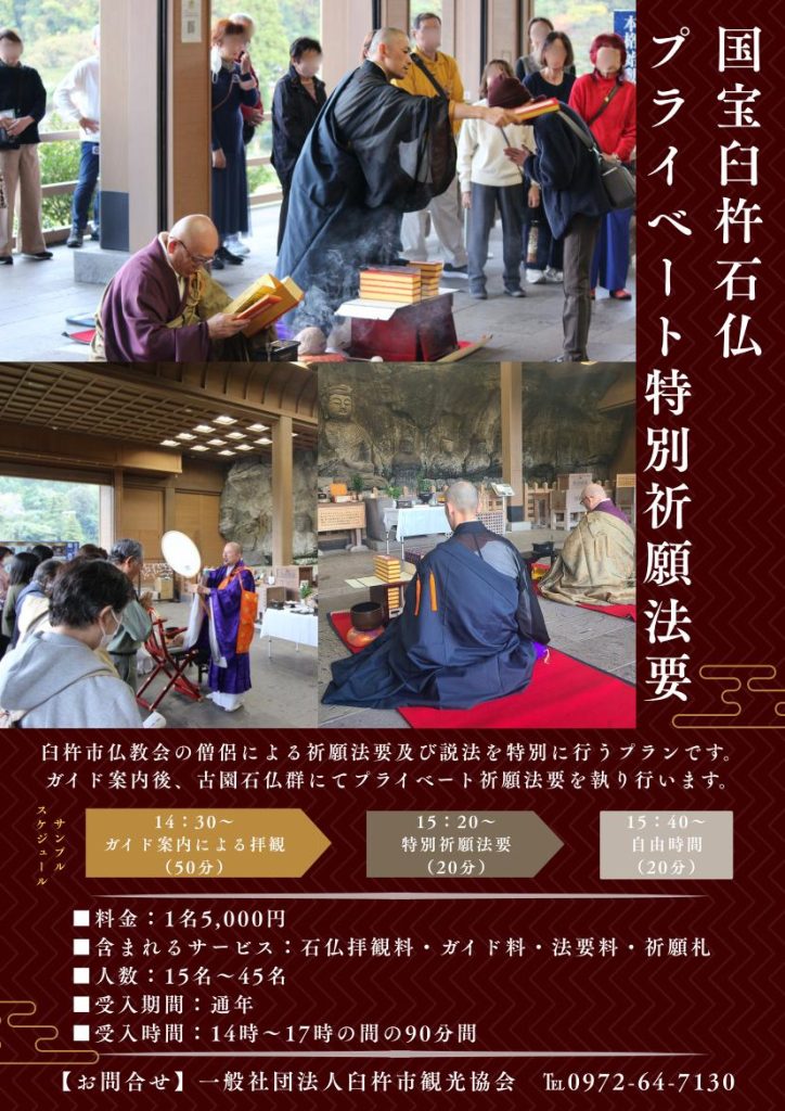 平安末期から鎌倉時代に彫られた国宝臼杵石仏(磨崖仏)での臼杵市仏教会僧侶によるプライベート祈願法要です。国宝臼杵石仏の61体の磨崖仏をガイドの案内で巡った後、石仏群の前にて僧侶の読経とともに祈願奉納いたします。