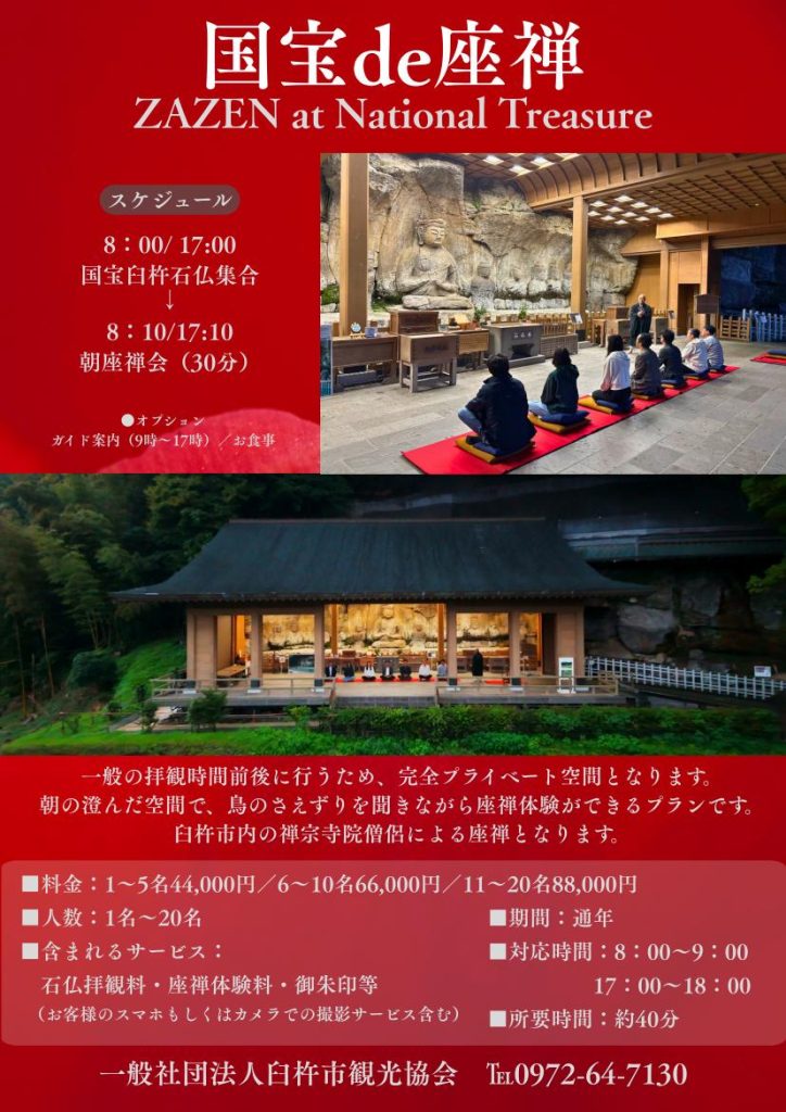 平安末期から鎌倉時代に彫られた国宝臼杵石仏(磨崖仏)での臼杵市内の禅宗寺院僧侶による朝座禅体験です。完全貸切空間にて、鳥の声や澄んだ空気に包まれながら、臼杵の寺院僧侶によるやさしい法話と座禅体験を行います。一生の思い出に残る特別な体験を!