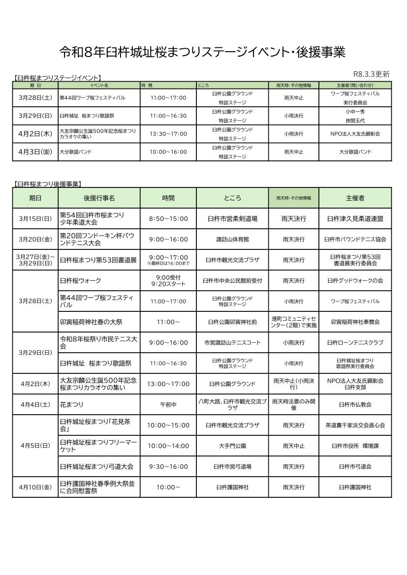 臼杵城址桜まつり実行委員会事務局 0972-64-7130