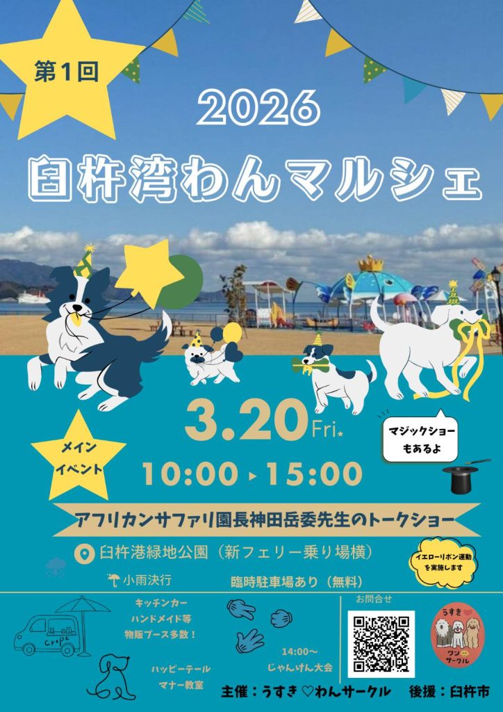 第1回目となる臼杵湾わんマルシェを開催します!アフリカンサファリ園長、神田岳委先生のトークショーも行います!その他、マジックショーやキッチンカー、ハンドメイドの物販ブースも盛りだくさん♪