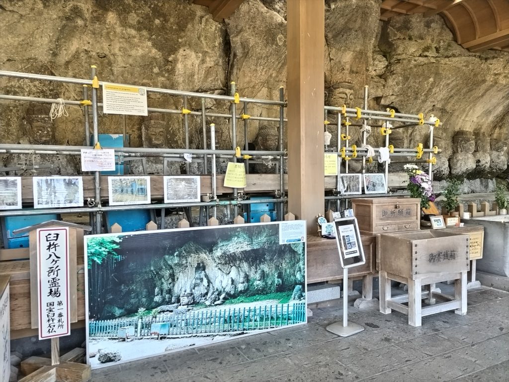 国宝臼杵磨崖仏では、仏体の表面に付着した着生生物類を紫外線にて枯死させ、手作業にて取り除くことで、生物類の繁茂による仏体の破損を予防しています。その際、柵内に足場を設置しますが、特別公開ではその足場に上って磨崖仏を普段より近い位置で観覧することができます!