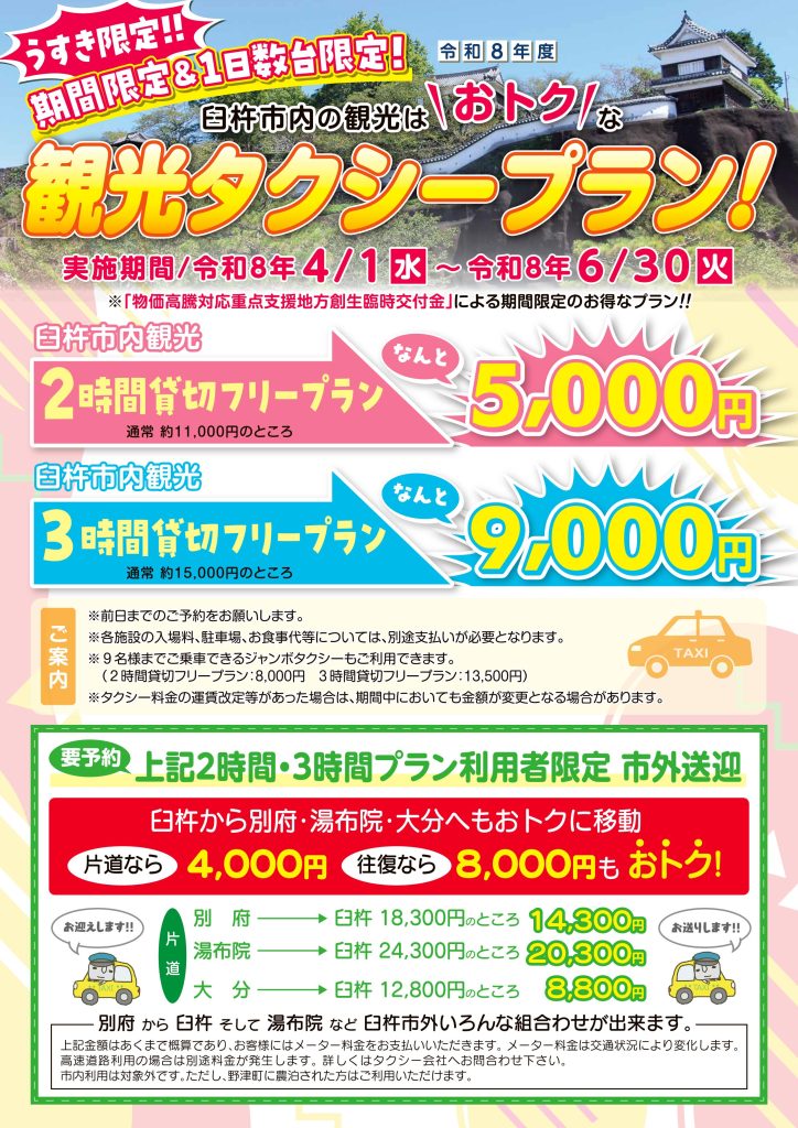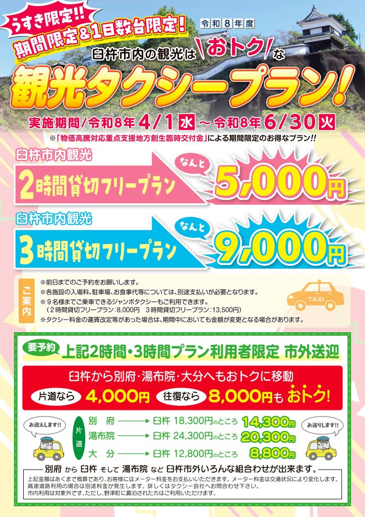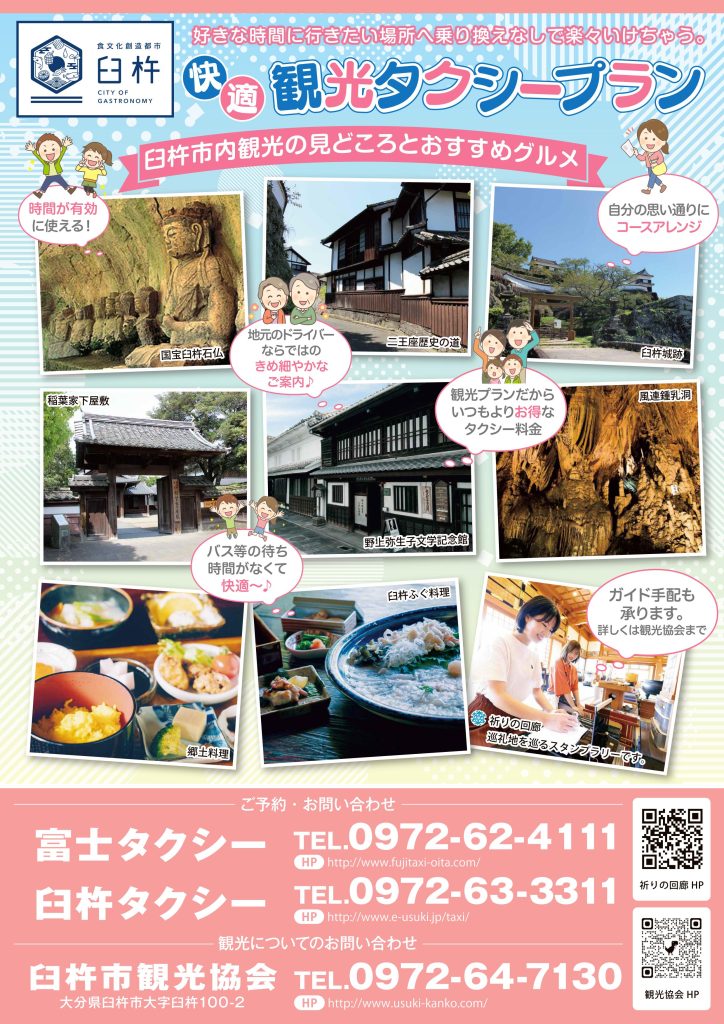 また観光タクシープランを利用される方限定、臼杵市外の送迎の割引(片道最大4,000円/往復最大8,000円)もございますので、ぜひご活用ください。