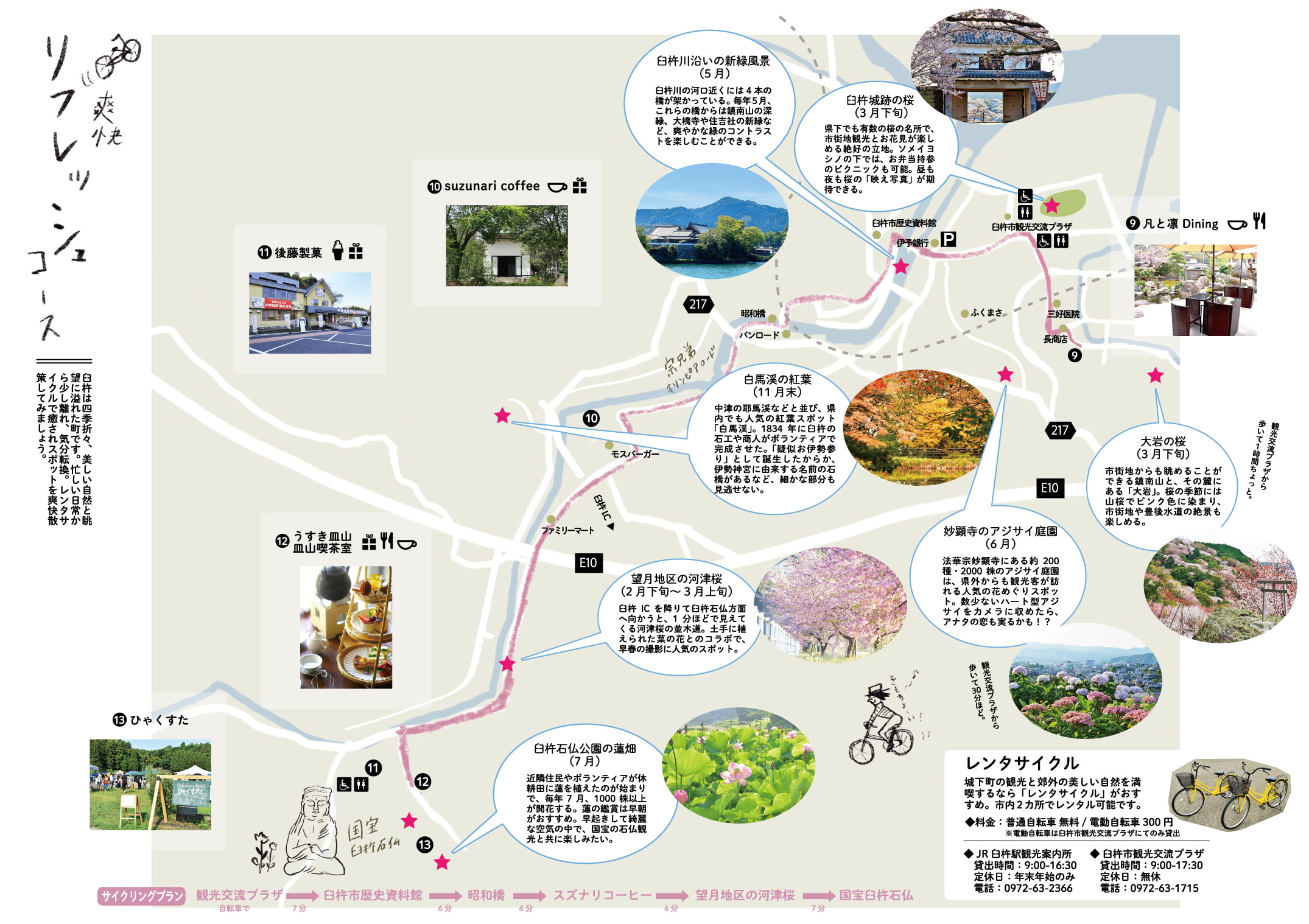 臼杵は四季折々、美しい自然と眺望に溢れた町です。忙しい日常から少し離れ、気分転換。レンタサイクルで癒されスポットを爽快散策してみましょう。